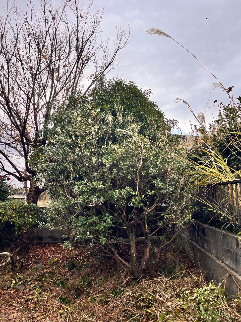 さらに銀木犀も、現在はもっともっとコンパクトになっています。いくつも太い幹が出てきていたので、そのうち枯れ枝ばかりの幹をカットして、一本にしました。
